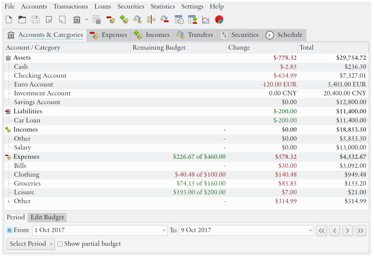 - La principale vue du compte indique la valeur totale des comptes et des catégories pour la date actuelle ou une date spécifiée, et la variation de la valeur, ainsi que le budget/budget restant, pour une période donnée.