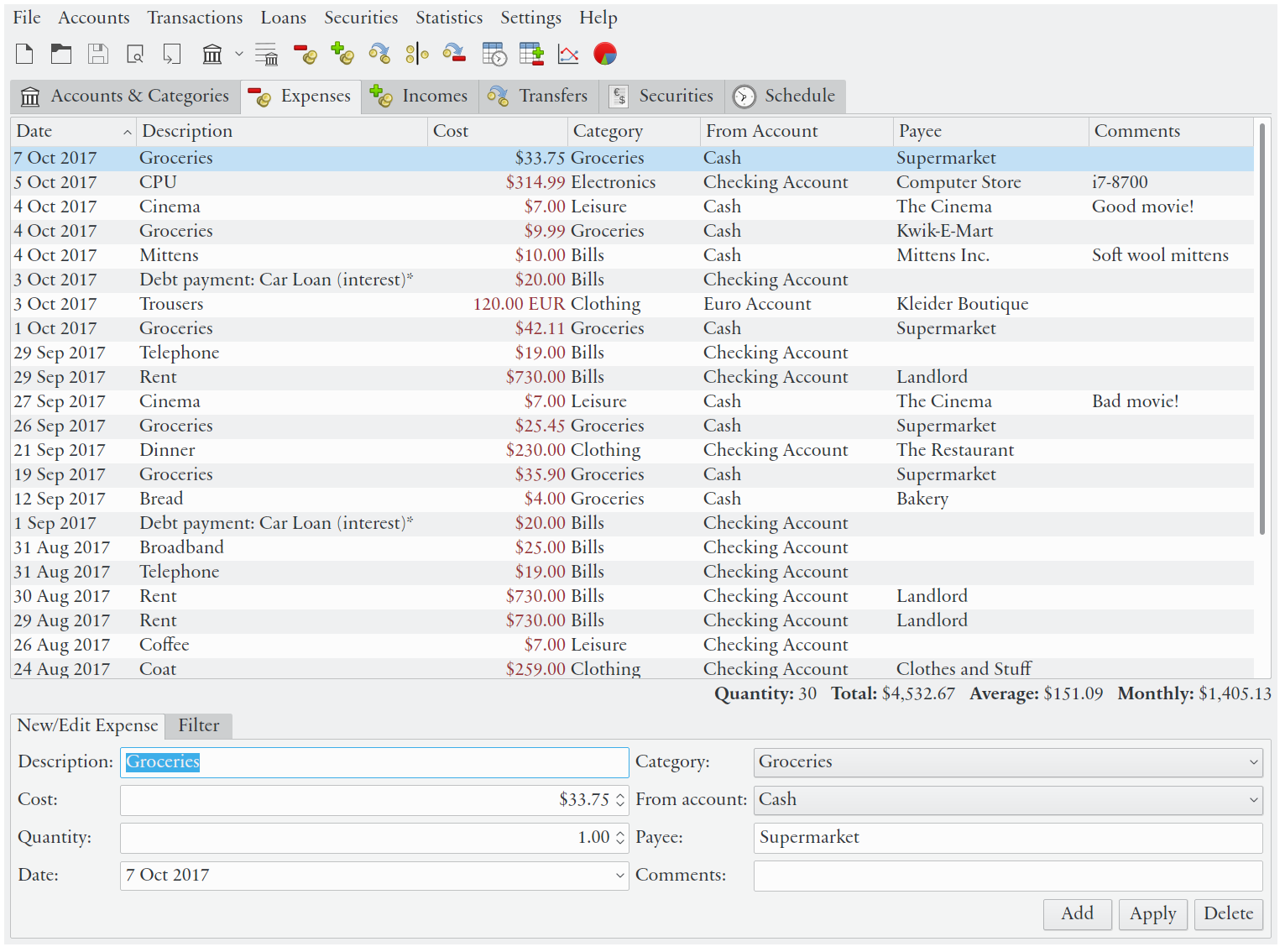 - Chaque liste de transactions affiche des statistiques descriptives de base et permet de filtrer les transactions en fonction de la date, de la valeur, de la catégorie/compte, de la description et du bénéficiaire.