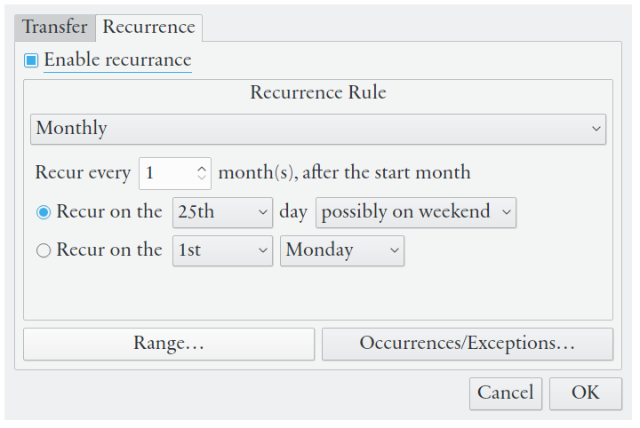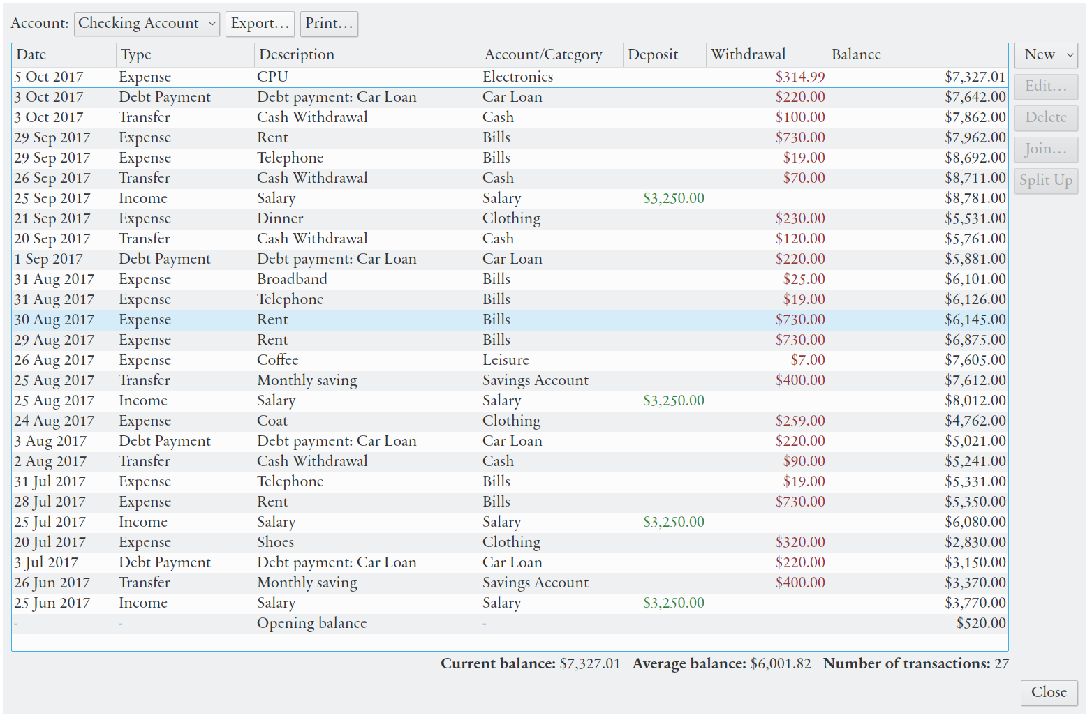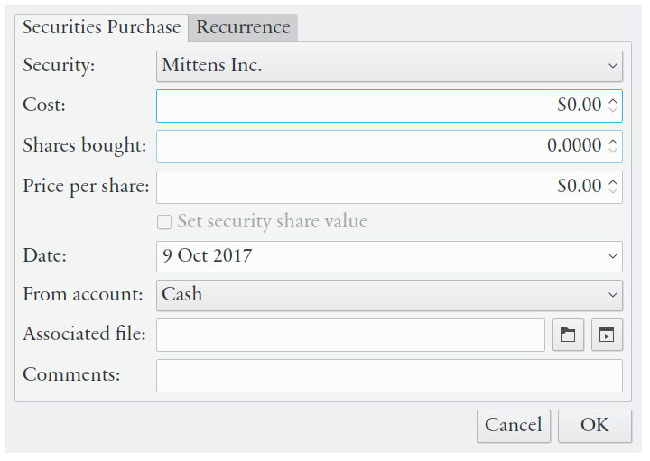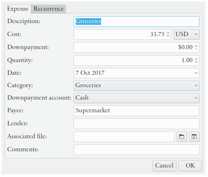 - Propriétés de la transaction: description, valeur, quantité, date, bénéficiaire/payeur, de/vers compte/catégorie, étiquettes, fichiers associés, liens et commentaires (plus les propriétés spécifiques pour les transactions liées aux titres et aux prêts)