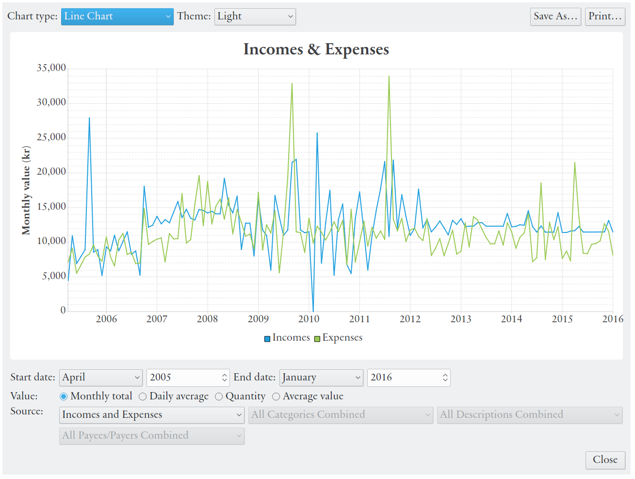 - Diagrammes linéaires, diagrammes à barres et tableaux pour l'affichage du changement de bénéfices, des revenus et des dépenses au fil du temps, pour toutes les catégories (ou étiquettes), une catégorie spécifique ou une description spécifique au sein d'une catégorie