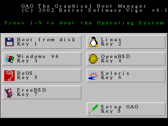 GAG (Gestor de Arranque Grafico en espagnol) est un chargeur d'amorçage, c'est-à-dire un programme qui sert à choisir et démarrer le système d'exploitation à utiliser. C'est une alternative au chargeur d'amorçage par défaut d'Ubuntu: GRUB.