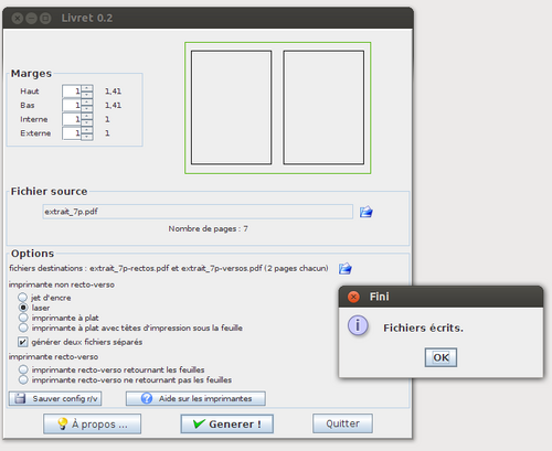 Livret est un petit programme libre écrit en Java permettant de créer des petits livres à partir d’un document au format PDF. Il crée, à partir d’un fichier source PDF, deux fichiers contenant les rectos et les versos prêts à être imprimés et agrafés.