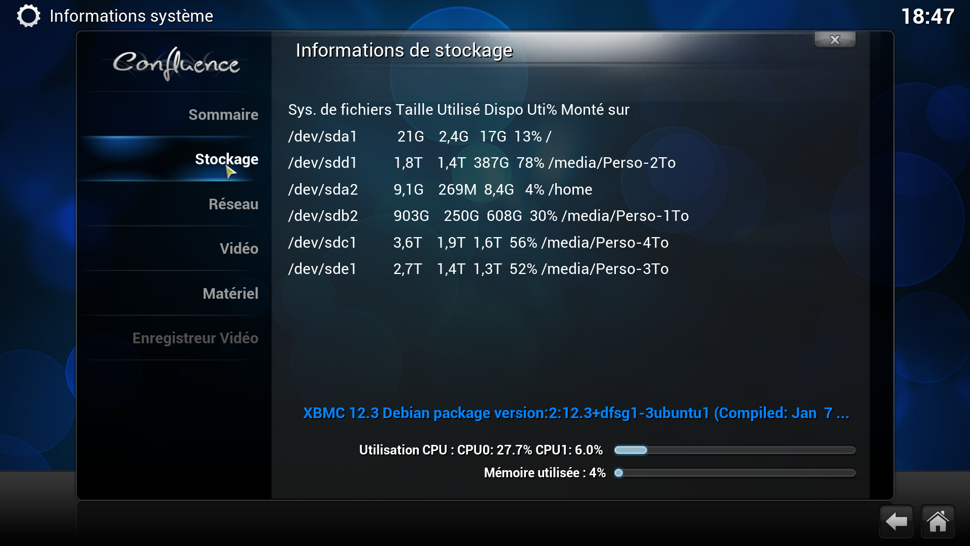 Concrètement, j'y ai adjoint 4 disques durs faisant respectivement 1, 2, 3, 4To (acquis au fil du temps et formatés en Ext4), et un SSD de 32Go pour le système (amplement suffisant).